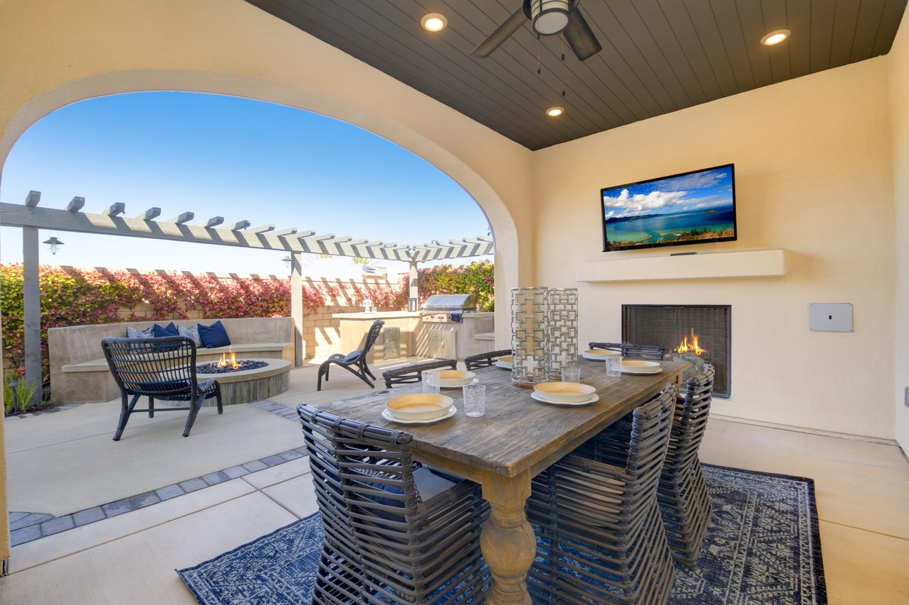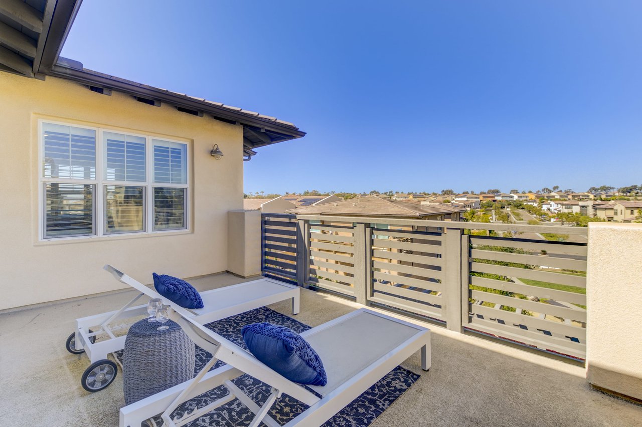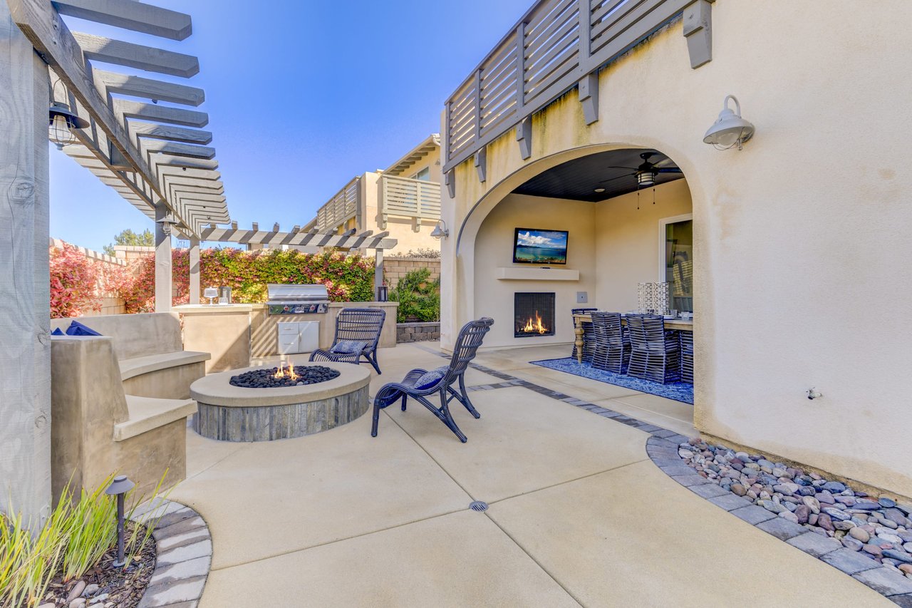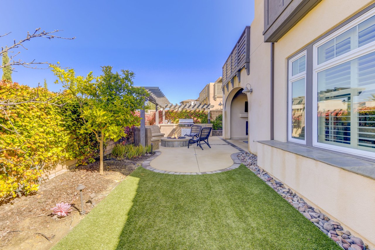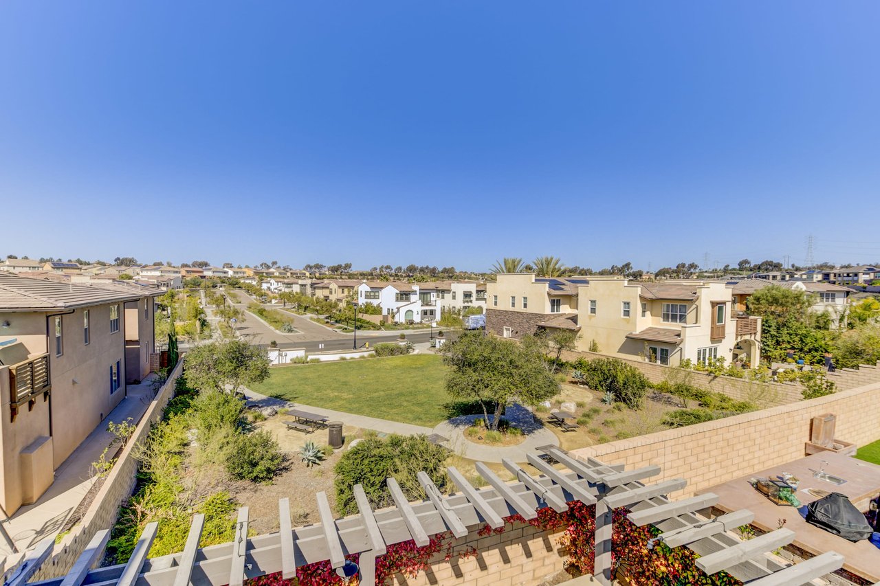Gorgeous turn-key Sterling Home in Pacific Highlands Ranch. Walking distance to a planned community park and Del Mar School District elementary school opening in 2022. One of the only homes on this side of Elegante with no neighbor behind you! Amazing home upgrades include: desirable open floor plan, beautiful kitchen with granite countertops, GE Monogram appliances and soft close cabinets, custom wood floors, plantation shutters, owned solar, whole house fan, reverse osmosis system, water softener, central AC and heating, built-in surround sound in family and bonus living room, and two laundry rooms. In-law suite conveniently located downstairs along with upgraded office / kitchenette. Sliding glass doors in great room open up to backyard and California Room with TV and a fireplace - perfect for entertaining. Enjoy the built-in outdoor BBQ area, fire pit with seating and low maintenance backyard with fruit trees. You can even see hot air balloons fly by most evenings! 4 Bedrooms upstairs including a spacious bonus living room. Huge primary bedroom with views overlooking the community and park behind you! Amazing spacious walk-in primary closet with plush carpet and custom wood cabinets. 3 car garage with built-in storage racks and shelves, and a 240 volt outlet for electric vehicle charging. Walking distance to parks, trails and private Solterra Swim Club. Close to the Pacific Highlands Ranch Shopping Center (The Village) and the 56/5/15 freeways.