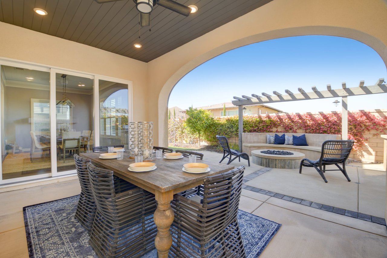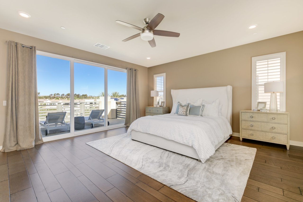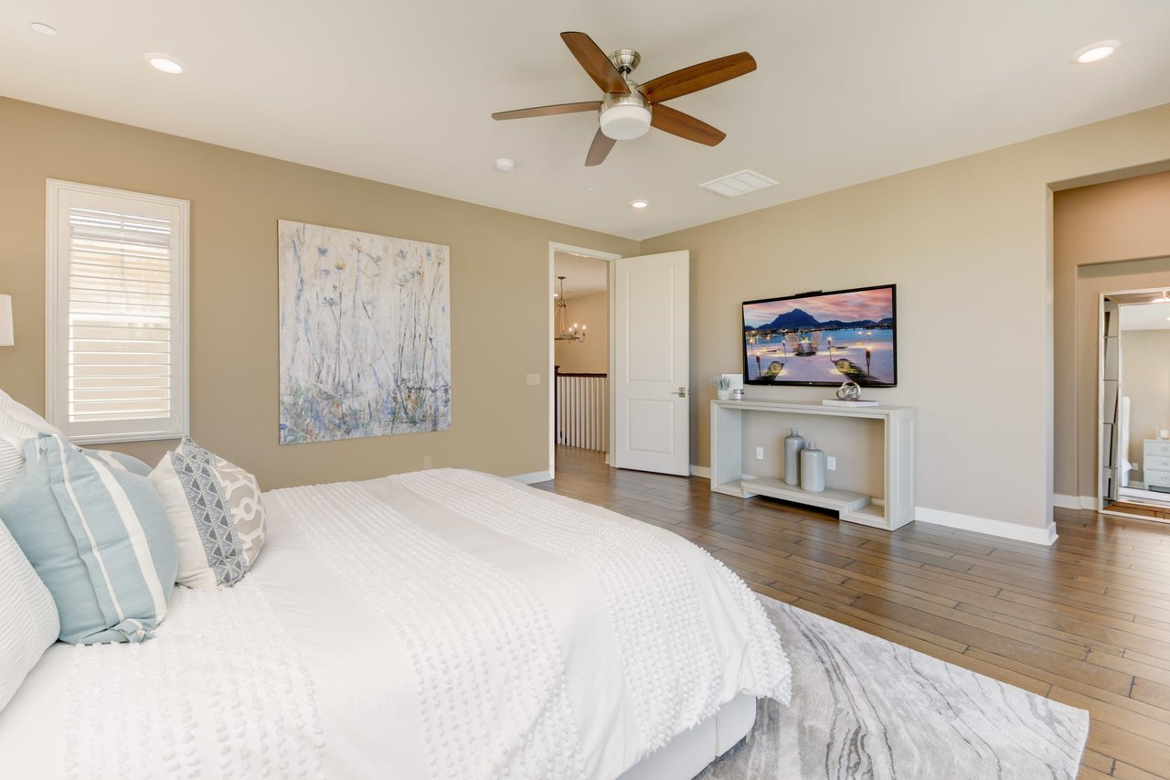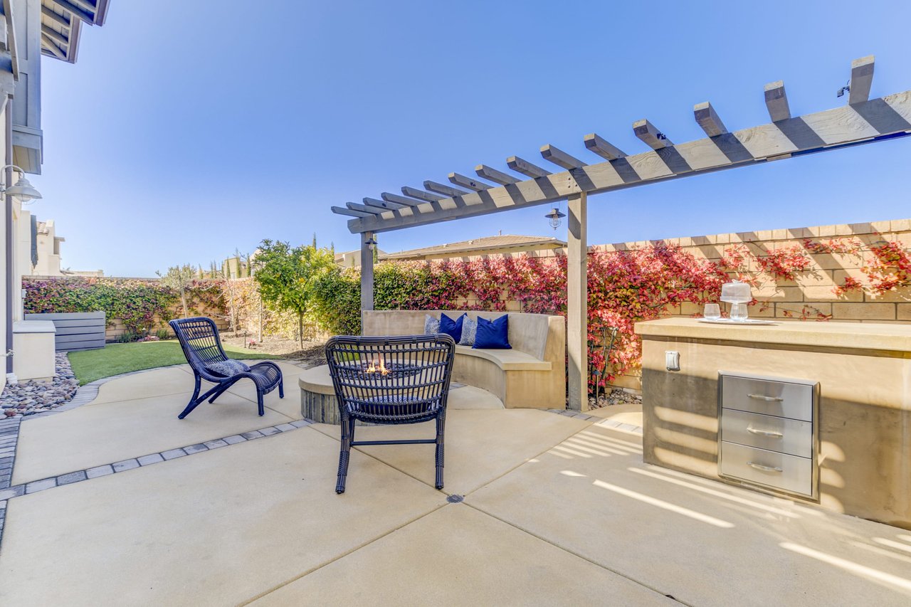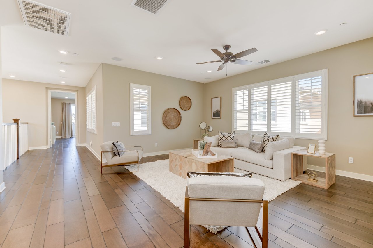 Gorgeous turn-key Sterling Home in Pacific Highlands Ranch. Walking distance to a planned community park and Del Mar School District elementary school opening in 2022. One of the only homes on this side of Elegante with no neighbor behind you! Amazing home upgrades include: desirable open floor plan, beautiful kitchen with granite countertops, GE Monogram appliances and soft close cabinets, custom wood floors, plantation shutters, owned solar, whole house fan, reverse osmosis system, water softener, central AC and heating, built-in surround sound in family and bonus living room, and two laundry rooms. In-law suite conveniently located downstairs along with upgraded office / kitchenette. Sliding glass doors in great room open up to backyard and California Room with TV and a fireplace - perfect for entertaining. Enjoy the built-in outdoor BBQ area, fire pit with seating and low maintenance backyard with fruit trees. You can even see hot air balloons fly by most evenings! 4 Bedrooms upstairs including a spacious bonus living room. Huge primary bedroom with views overlooking the community and park behind you! Amazing spacious walk-in primary closet with plush carpet and custom wood cabinets. 3 car garage with built-in storage racks and shelves, and a 240 volt outlet for electric vehicle charging. Walking distance to parks, trails and private Solterra Swim Club. Close to the Pacific Highlands Ranch Shopping Center (The Village) and the 56/5/15 freeways.