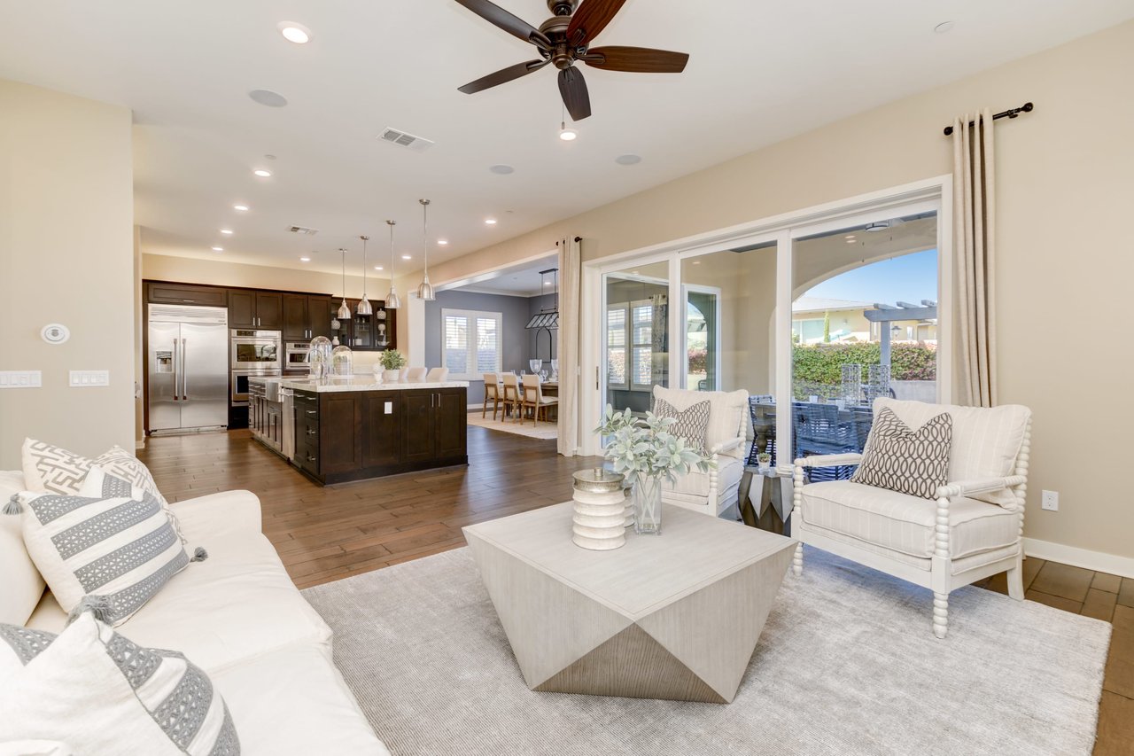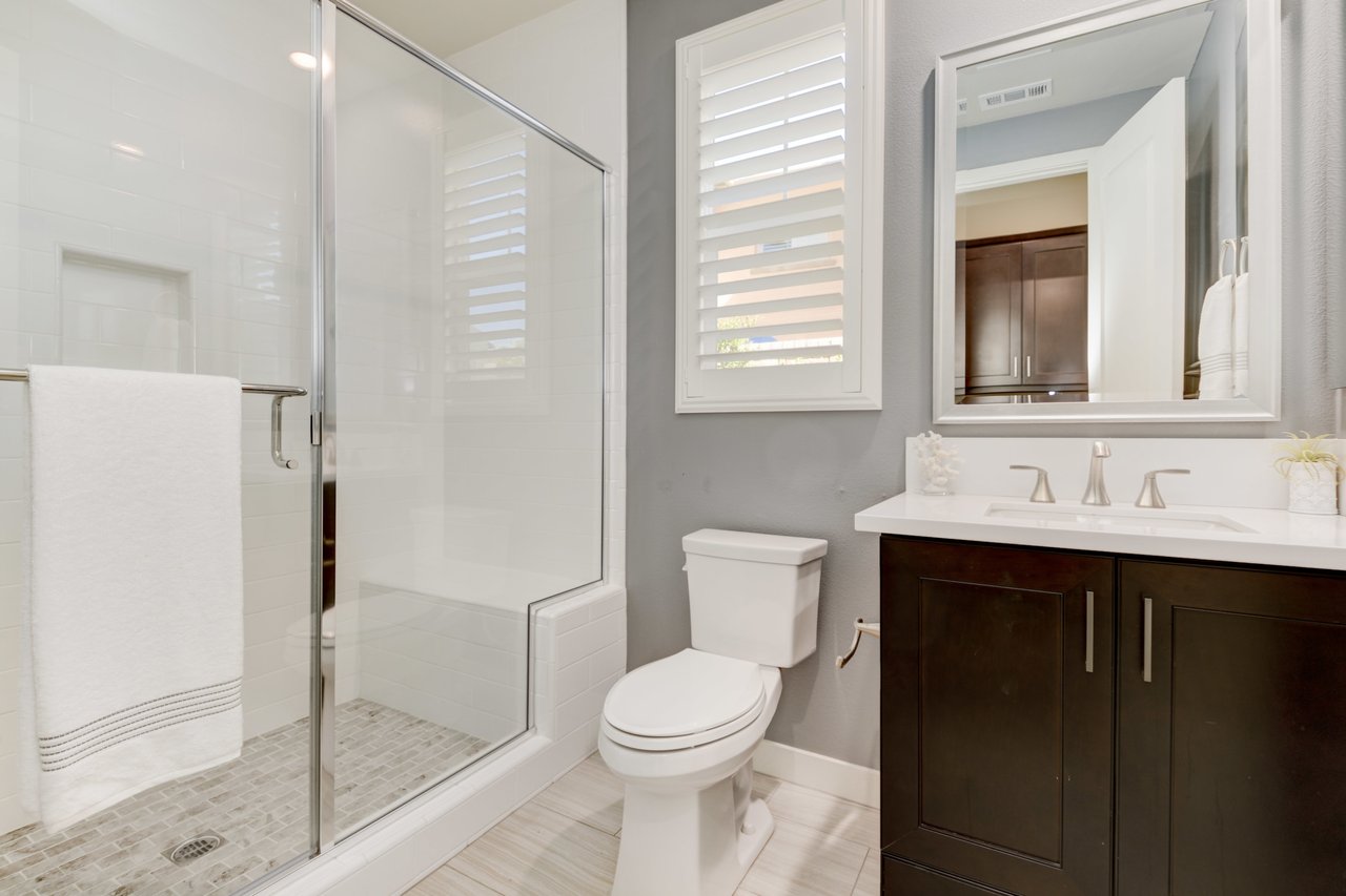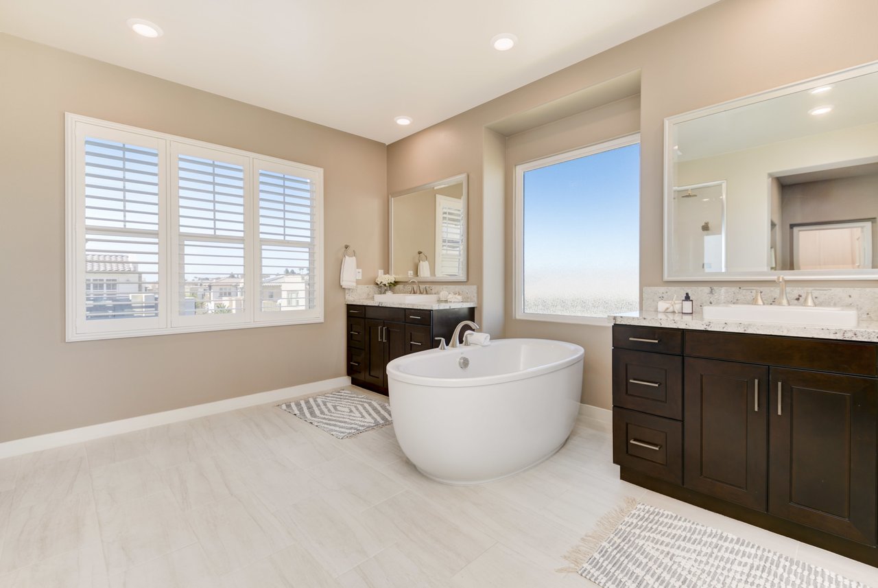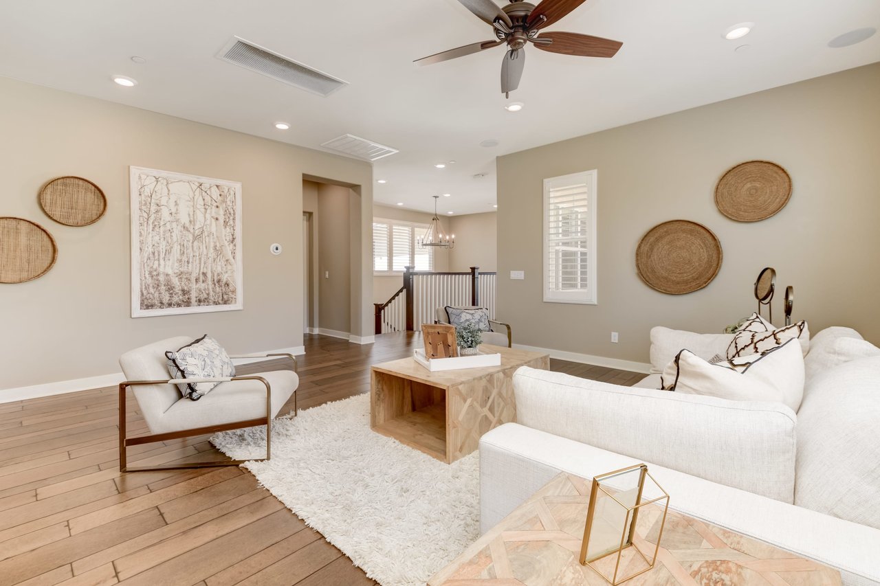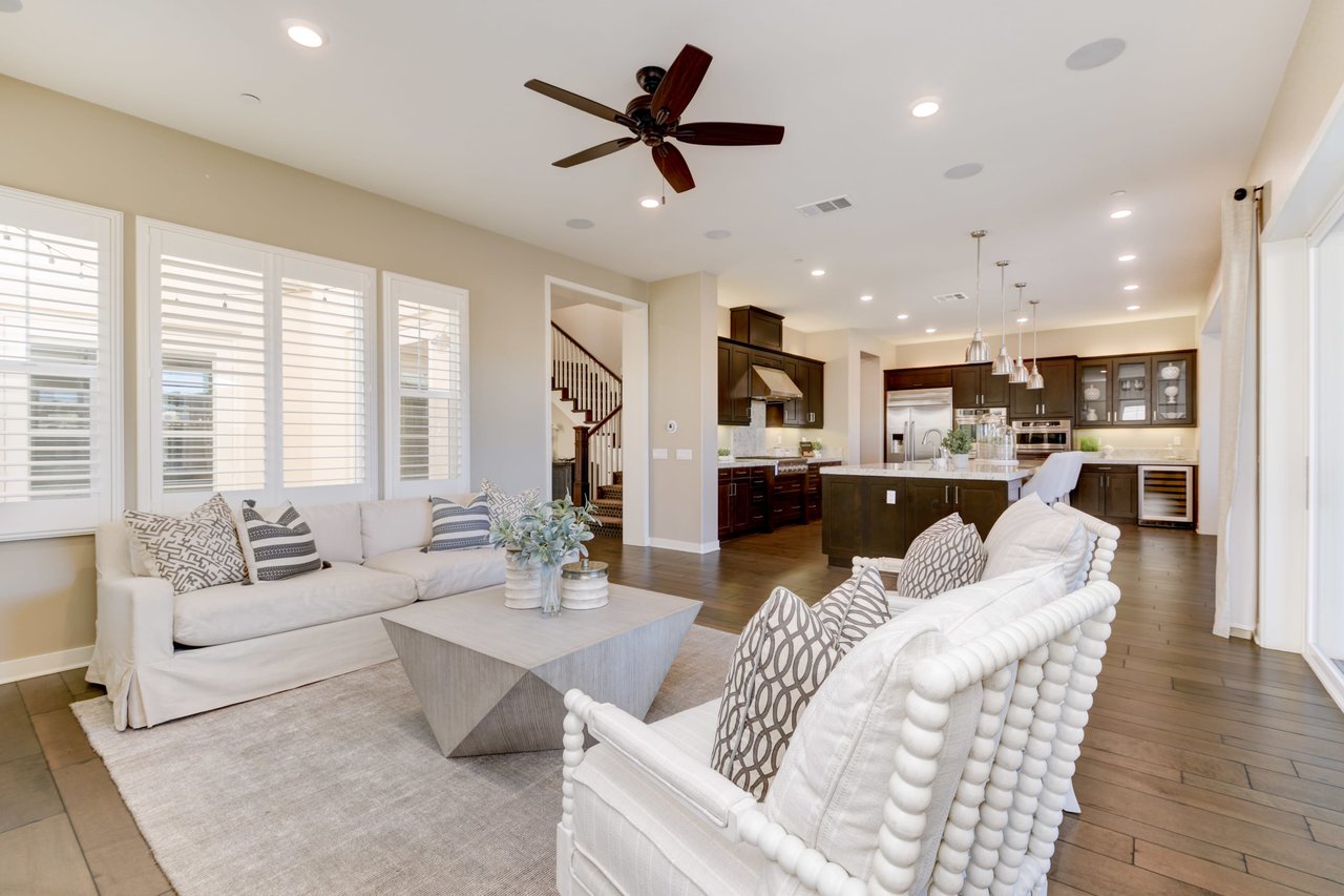Gorgeous turn-key Sterling Home in Pacific Highlands Ranch. Walking distance to a planned community park and Del Mar School District elementary school opening in 2022. One of the only homes on this side of Elegante with no neighbor behind you! Amazing home upgrades include: desirable open floor plan, beautiful kitchen with granite countertops, GE Monogram appliances and soft close cabinets, custom wood floors, plantation shutters, owned solar, whole house fan, reverse osmosis system, water softener, central AC and heating, built-in surround sound in family and bonus living room, and two laundry rooms. In-law suite conveniently located downstairs along with upgraded office / kitchenette. Sliding glass doors in great room open up to backyard and California Room with TV and a fireplace - perfect for entertaining. Enjoy the built-in outdoor BBQ area, fire pit with seating and low maintenance backyard with fruit trees. You can even see hot air balloons fly by most evenings! 4 Bedrooms upstairs including a spacious bonus living room. Huge primary bedroom with views overlooking the community and park behind you! Amazing spacious walk-in primary closet with plush carpet and custom wood cabinets. 3 car garage with built-in storage racks and shelves, and a 240 volt outlet for electric vehicle charging. Walking distance to parks, trails and private Solterra Swim Club. Close to the Pacific Highlands Ranch Shopping Center (The Village) and the 56/5/15 freeways.