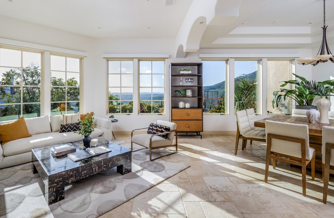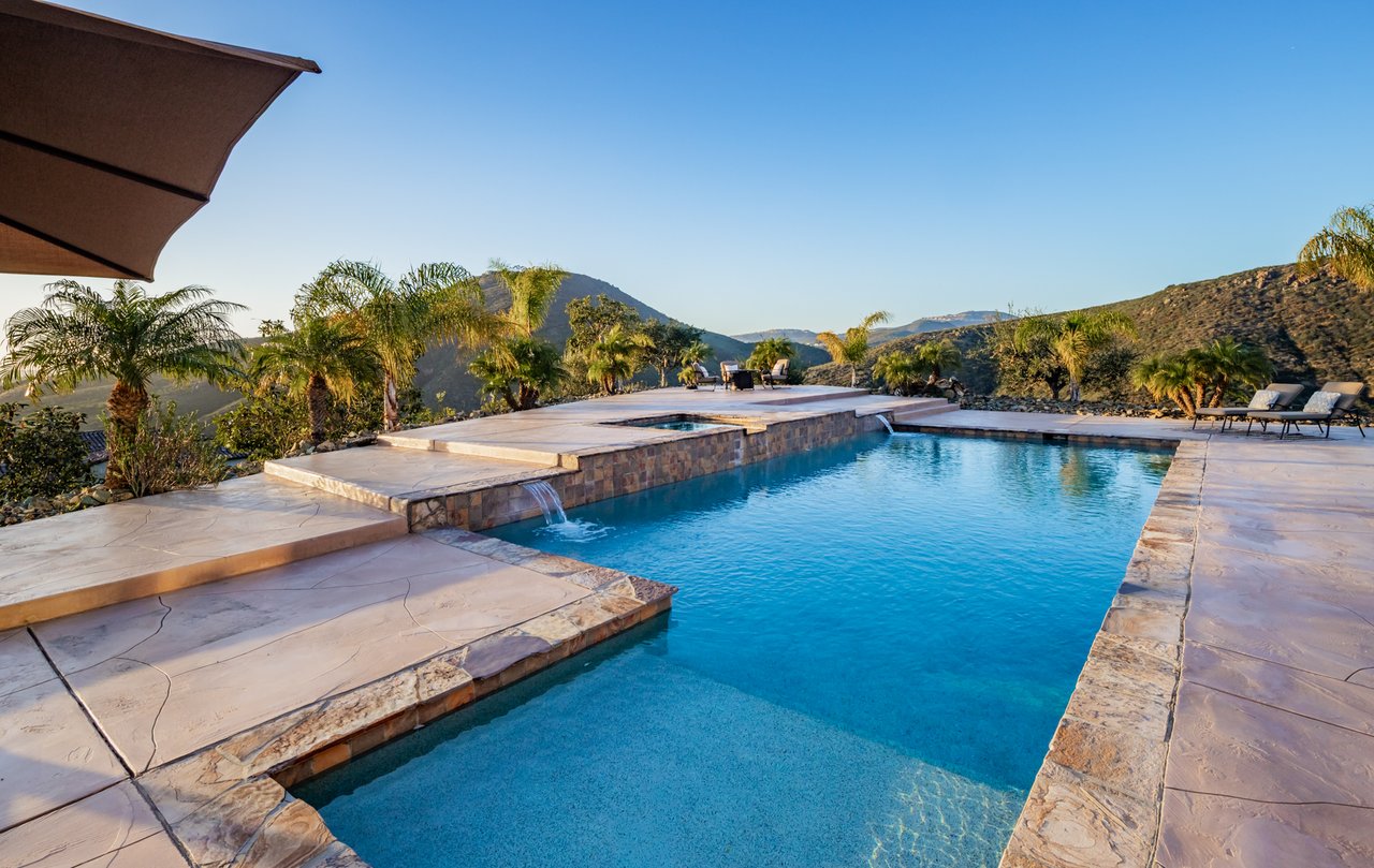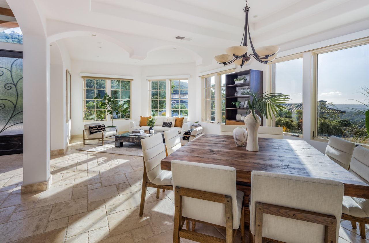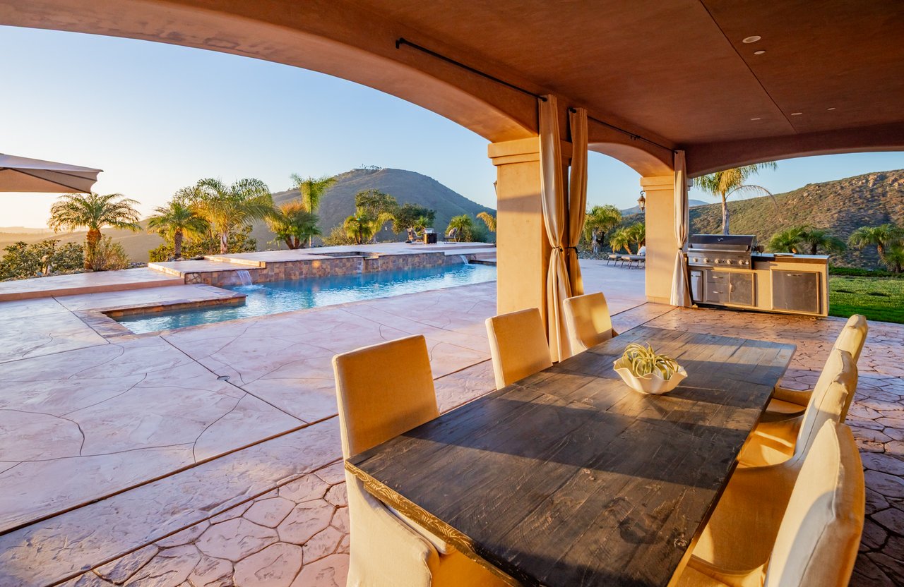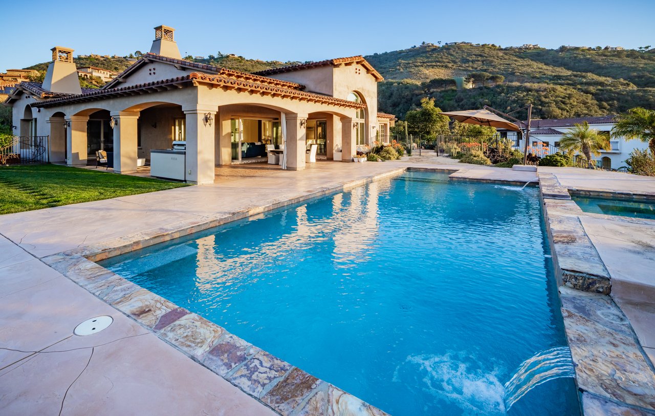 Single-level luxury with sweeping Rancho Santa Fe and peek ocean views, set behind the guarded gates of Cielo. This single-level 5-bedroom, 4.5-bath estate offers northwest views, privacy, and refined indoor-outdoor living on a generous lot within the Rancho Santa Fe community. Soaring 17 to 20-foot ceilings define the main living areas, while four bedrooms feature en-suite baths for elevated comfort. The fifth bedroom, currently configured as an office and complete with a closet and murphy bed, can serve as an additional bedroom. The oversized primary suite boasts its own fireplace, outdoor access, and sweeping views, along with a spa-caliber bath complete with a soaking tub, dual-head shower, and expansive walk-in closet. The chef’s kitchen is equipped with Wolf range, large pantry, and secondary prep area. Outdoors, a covered entertaining pavilion overlooks the resort-style pool and spa, surrounded by low-maintenance landscaping and endless views. Additional highlights include 11kw owned solar with critical load battery backup system, EV charger, tankless water heater, and three-car garage with epoxy floors. Residents enjoy access to Cielo’s private clubhouse and resort-style amenities, all within the top-rated Rancho Santa Fe School District.