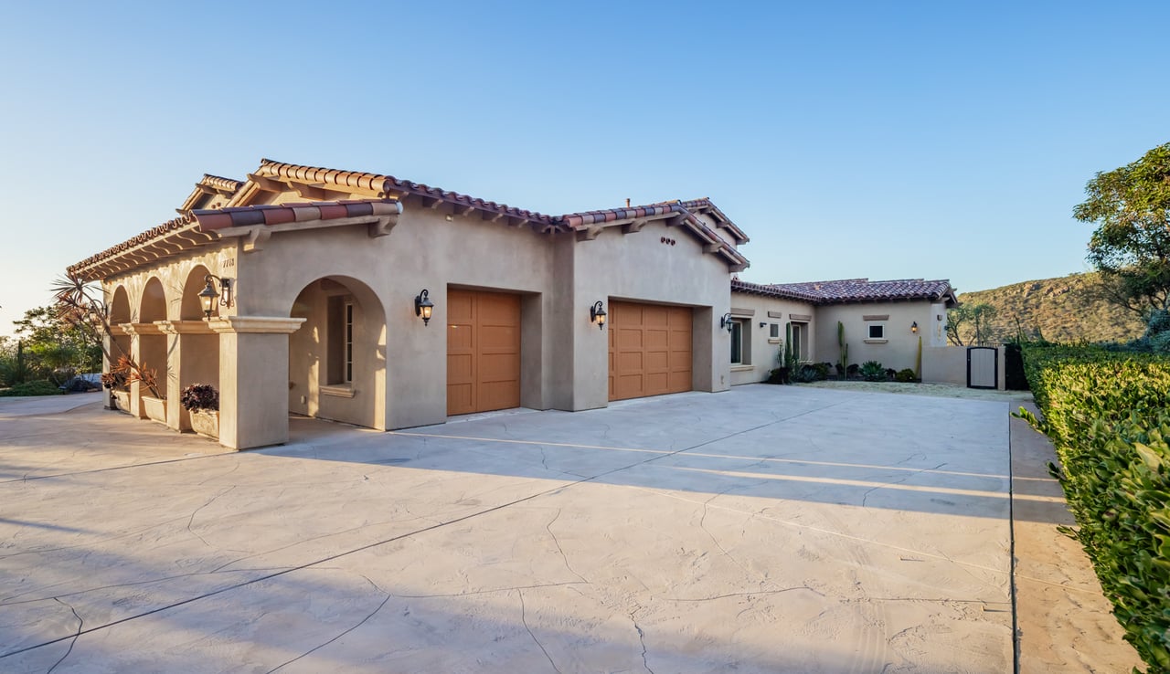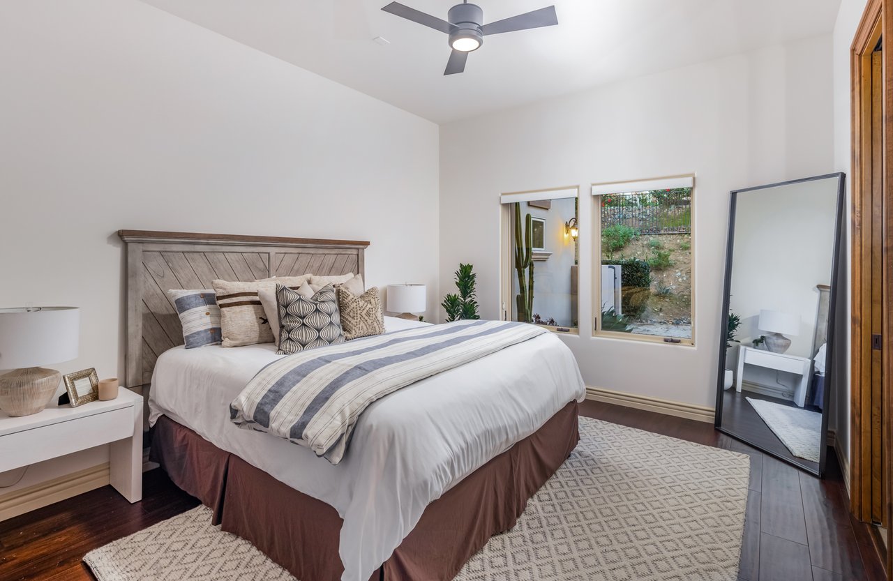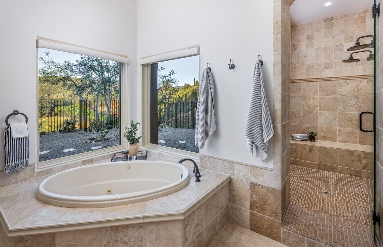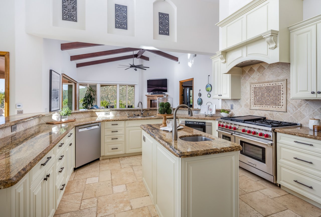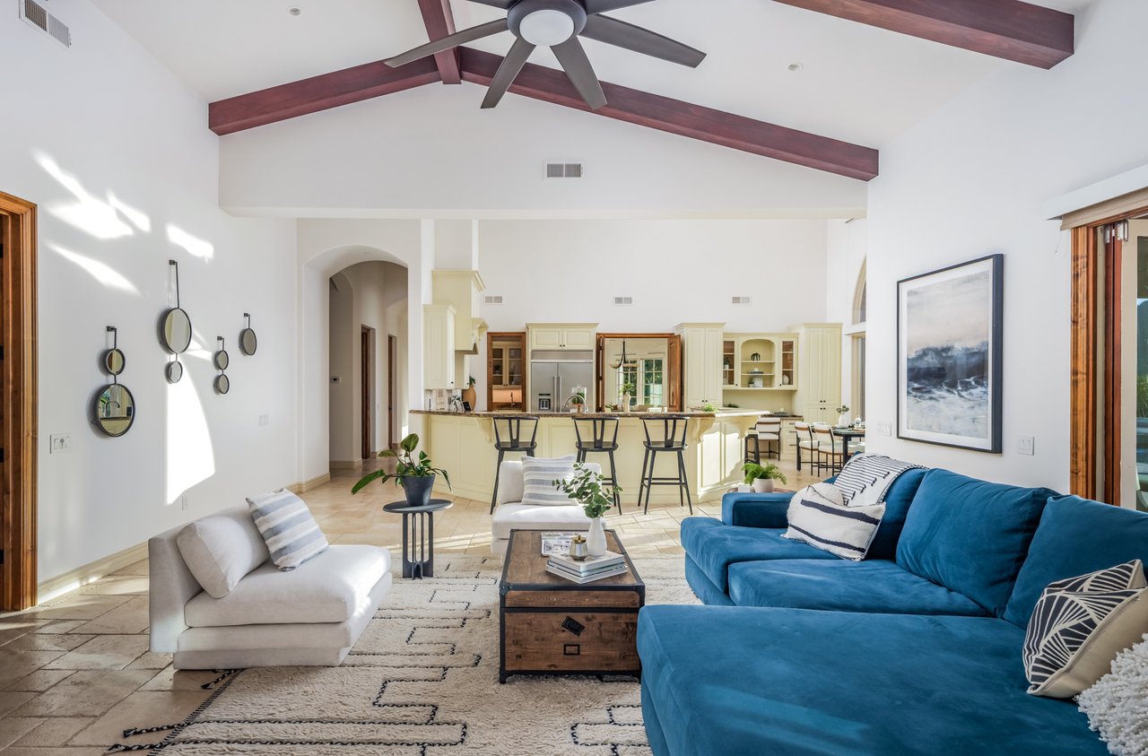 Single-level luxury with sweeping Rancho Santa Fe and peek ocean views, set behind the guarded gates of Cielo. This single-level 5-bedroom, 4.5-bath estate offers northwest views, privacy, and refined indoor-outdoor living on a generous lot within the Rancho Santa Fe community. Soaring 17 to 20-foot ceilings define the main living areas, while four bedrooms feature en-suite baths for elevated comfort. The fifth bedroom, currently configured as an office and complete with a closet and murphy bed, can serve as an additional bedroom. The oversized primary suite boasts its own fireplace, outdoor access, and sweeping views, along with a spa-caliber bath complete with a soaking tub, dual-head shower, and expansive walk-in closet. The chef’s kitchen is equipped with Wolf range, large pantry, and secondary prep area. Outdoors, a covered entertaining pavilion overlooks the resort-style pool and spa, surrounded by low-maintenance landscaping and endless views. Additional highlights include 11kw owned solar with critical load battery backup system, EV charger, tankless water heater, and three-car garage with epoxy floors. Residents enjoy access to Cielo’s private clubhouse and resort-style amenities, all within the top-rated Rancho Santa Fe School District.